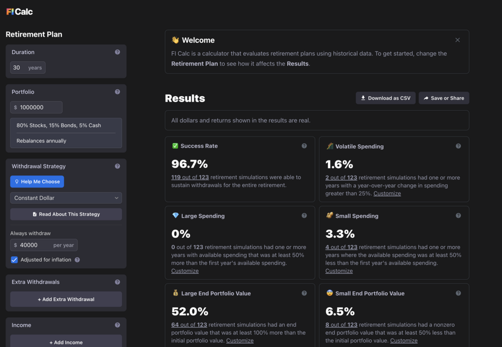 FI Calc is a calculator that simulates retirements using historical data, which is a strategy called "backtesting." The classic 4% Rule was derived from backtesting.